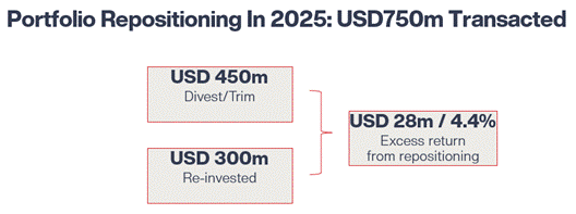 This portfolio repositioning has been in progress for some time, and over the 2025 calendar year over USD 750 million of the portfolio was transacted, including USD 450 million being trimmed and sold and reinvesting USD 300 million. This reposition is accretive over the long term and has generated approximately an extra 4.4% points to the portfolio's calendar year return compared to if we had not made any changes.