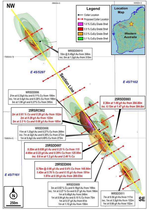 · 3m at 1.98 g/t and 0.27% Cu from 395m WRSDD006