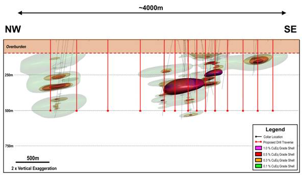 Figure 3: WSBN Red Setter long section view of all drilling, highlighting the current area of interest and 2026 proposed drilling. 3DM shapes generated in Leap Frog software using Copper Equivalent % (CuEq%.) (Prices USD: Cu $5.85/lb, Au $5,170/oz → factor ≈ 1.29, CuEq % ≈ Cu% + (Au ppm × 1.29))