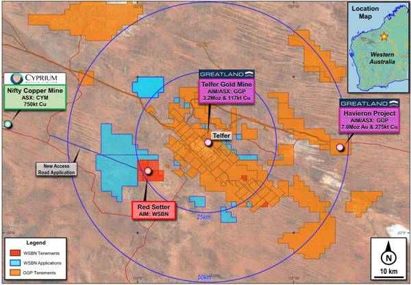 Wishbone Gold Plc is pleased to provide an exploration update from its Red Setter Project in the Paterson Province of Western Australia, located 20km south-west of Greatland Gold Plc's (AIM and ASX: GGP) Telfer gold mine, and 50km east of Cyprium Metals Ltd's (ASX: CYM) Nifty copper mine (Figure 1).