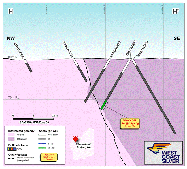 · 2m @ 39g/t Ag from 12m (25WCAC071) at Elizabeth Hill South, on the ultramafic/granite contact, confirming mineralization well south of Elizabeth Hill.