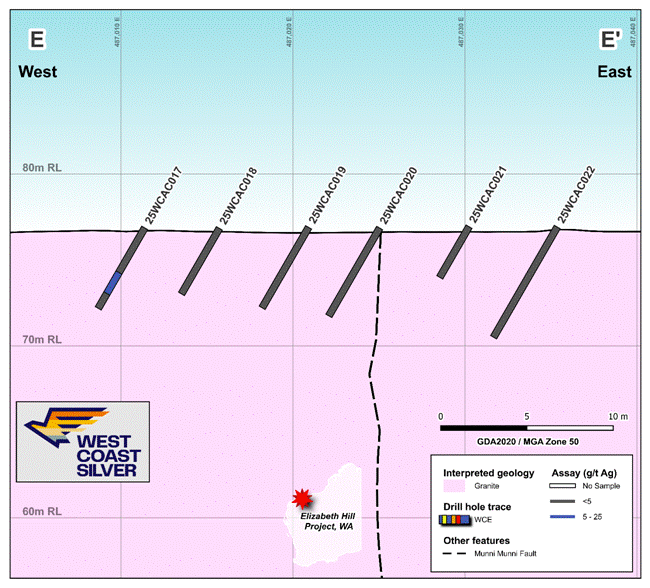 Mineralisation intersected in 25WCAC008 (0.5m @ 61g/t Ag from 8m), located 225m north of the Elizabeth Hill mine on the northern extension of the Munni Munni Fault (Figures 1, 2 and 11; Table 1), is important for demonstrating the potential to the north of the historical workings.