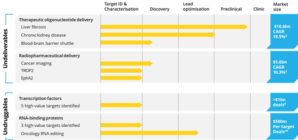 In parallel, the Company is developing an internal therapeutic pipeline targeting the oligonucleotide therapeutics space, particularly focused on undeliverable and undruggable opportunities, representing target classes that are challenging for conventional drug modalities. With 30 approved oligonucleotide therapies and hundreds of clinical development programmes, oligonucleotide drugs represent a rapidly growing modality.