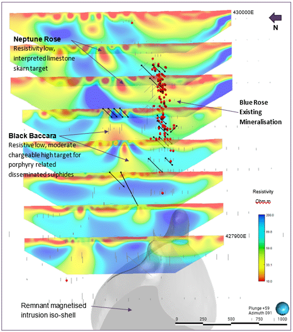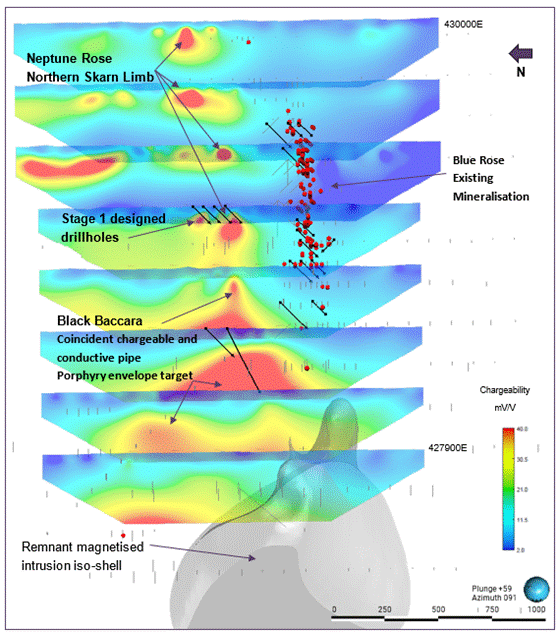 o Neptune Rose Target: continuous ~1,200m chargeability anomaly coincident with the interpreted northern fold limb, supporting the Company's interpretation for scalable resource potential from shallow, high grade skarn mineralisation