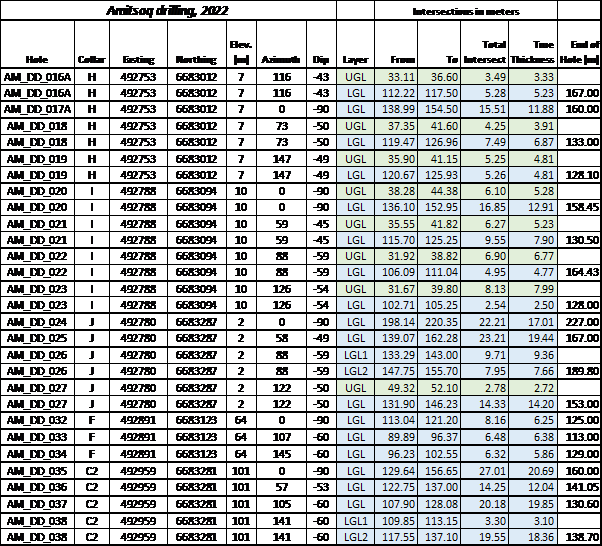 The drilling shows thicknesses of the UGL to be between 2.72m and 7.99m and the LGL to be between 2.50m and 20.69m (with a cut-off layer thickness of 2.0m). Combined with Phase 1 drilling in 2021 (reported on 3 December 2021), the results of this second phase drilling shows that the UGL is a coherent, well-defined ore body underlying most of the southwestern part of the island and open towards the south and towards the west, which appears to peter out towards the north. The LGL is present in all drill holes from both years (except at drill collar A from 2021, where projection shows the vertical hole AM_DD_013A stopped ca 10m short of the LGL). The thickest part of the LGL from the 2021 drilling was 15.60m and this is exceeded by this year's drilling with five holes intersecting the LGL with true thicknesses of 17.01m (AM_DD_024), 18.36m (AM_DD_038), 19.44m (AM_DD_025), 19.85m (AM_DD_037) and 20.69m (AM_DD_035), see Table 1 and Figure 5.
