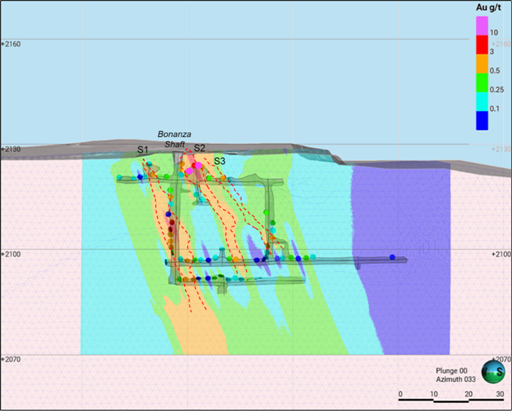 · Strong correlation between high-grade zones and interpreted ore shoots, with high grades being seen in the S2 shoot between 15 to 25m below ground surface